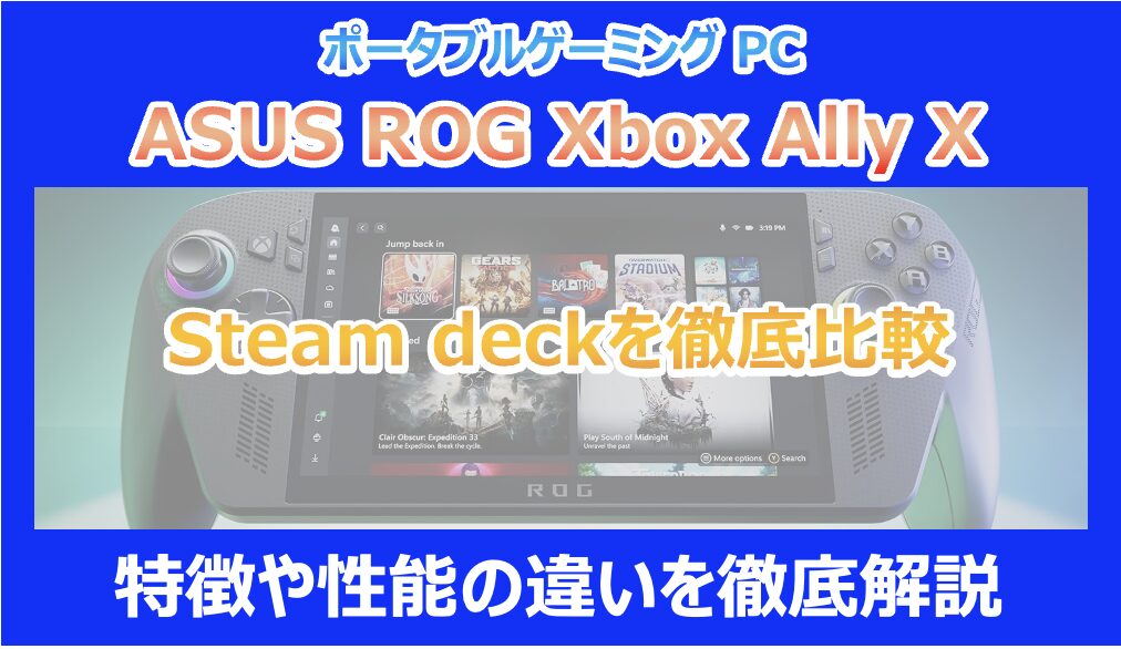 この記事を読んでいる方は、最近話題のポータブルゲーミングPC、特にASUSから登場した「ROG Xbox Ally X」が気になっているのではないでしょうか。 市場にはすでに「Steam Deck」という強力なライバルがいますが、「実際のところ、どちらが自分に合っているの?」「Ally Xの優れている点はどこ?」と悩んでいる方も多いと思います。