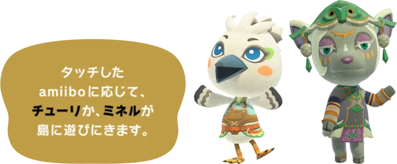 - 新住民「チューリ(ハキハキ)」と「ミネル(オトナ)」は、それぞれ対応するTotK系amiiboで呼び出し可能。