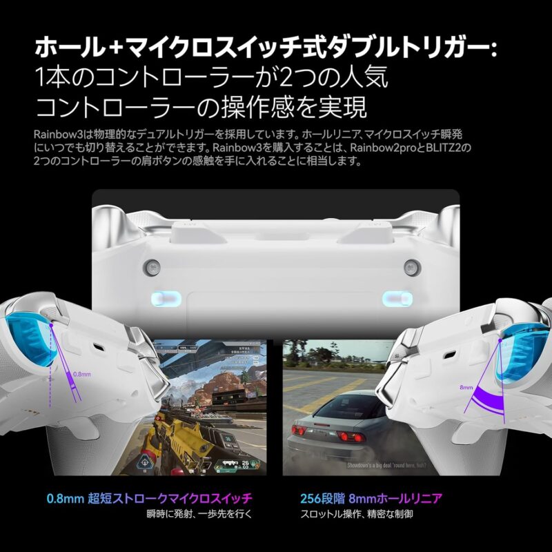 PCまたはXboxユーザーにとっての鉄板モデルです。 最大の特徴は、4つの着脱可能な背面パドル。 これにより、ジャンプ、スライディング、リロード、武器切り替えといった主要なアクションをすべて背面で完結させることができ、操作の自由度は他の追随を許しません。