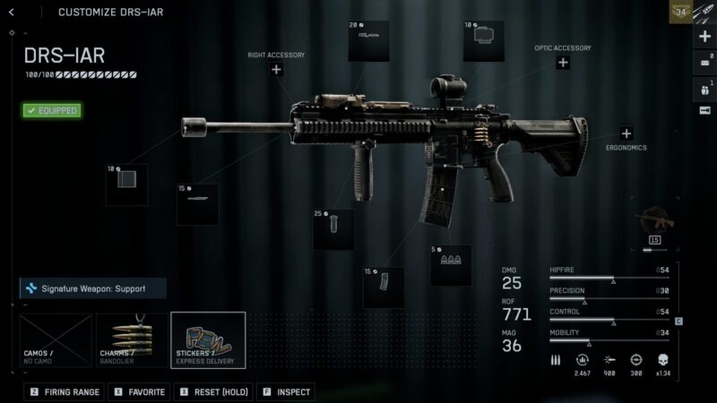 LMGカテゴリの武器は通常、ダッシュ速度やADS(サイト覗き込み)速度に重いペナルティが課せられます。 しかし、DRS-IARはこのペナルティが他のLMGに比べて大幅に軽減されています。 素の状態でもARに近い感覚でストレイフ(左右移動)撃ちが可能であり、ADS速度もLMGカテゴリ内では最速クラスです。 この高い機動性が、従来の「待ち」が基本だったLMGの運用セオリーを根底から覆しています。
