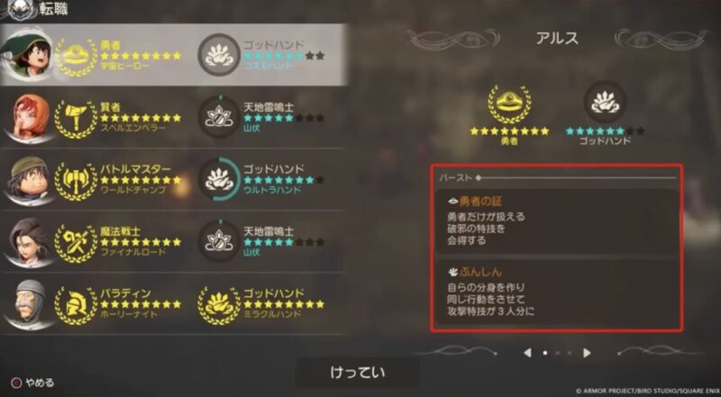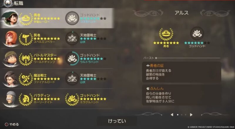 先行公開された条件欄のUIを見ると、勇者の転職条件から「ゴッドハンド」や「天地雷鳴士」が直接繋がっていないような形跡があります。 これは、ゴッドハンドを極めてそのまま勇者へ、という「最短ルート」に制限をかけ、より多様な職業を経験させるための開発側の意図が感じられます。