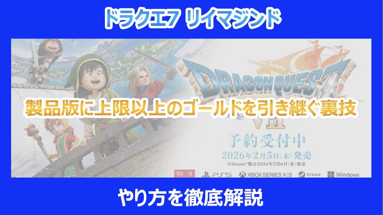 この記事を読んでいる方は、待望の新作『ドラゴンクエストVII エデンの戦士たち リイマジンド』の先行プレイ版をやり込んでおり、「製品版に少しでも有利な状態でデータを引き継ぎたい」と考えているはずです。 特に、先行プレイ版で設定されている「9,999ゴールド」という所持金の上限に物足りなさを感じ、それを突破して実質的に大量の資金を持ち込む方法を探しているのではないでしょうか。