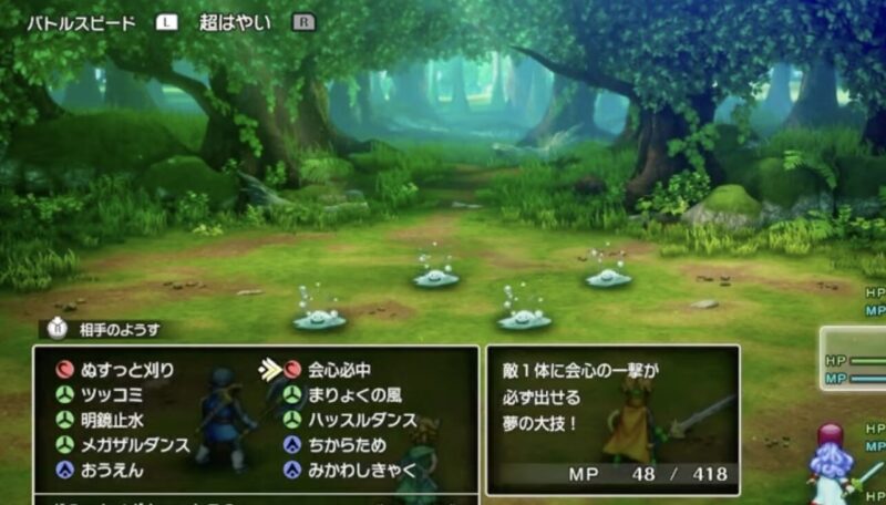 HD-2D版では、特技や呪文をショートカットに登録できる機能があります。 このショートカットに「口笛」をセットし、戦闘が終わるたびに「口笛」を吹き、戦闘→口笛→戦闘…という高速ループを作り出すこと。 これこそが、最速レベル上げの基本的なテクニックとなります。 「口笛」はサマルトリアの王子が比較的早いレベルで習得しますので、必ずショートカットに登録しておきましょう。