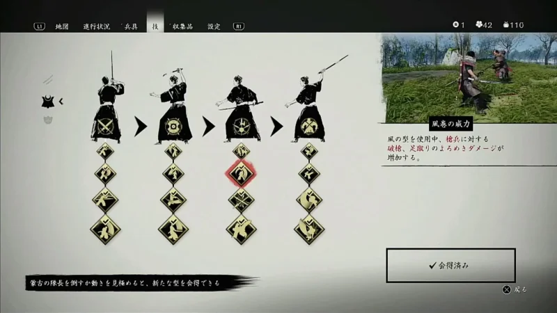 - 不動の心: 敵の強攻撃(ガード不能攻撃)を受け流せるようになる。(※中盤以降のスキル)