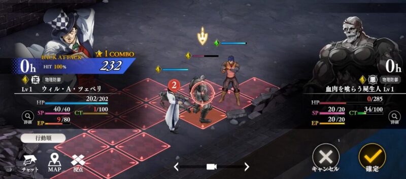 - 例3:スキルコンボ 花京院が「法皇の結界」で敵の行動を束縛し、動けない敵に対して承太郎が必殺技の「スタープラチナ・ザ・ワールド」を叩き込む。