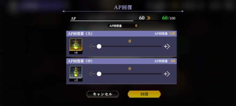 | AP回復薬 | アイテム消費 | 50/100 AP | – | イベント報酬など。2倍期間まで温存 |