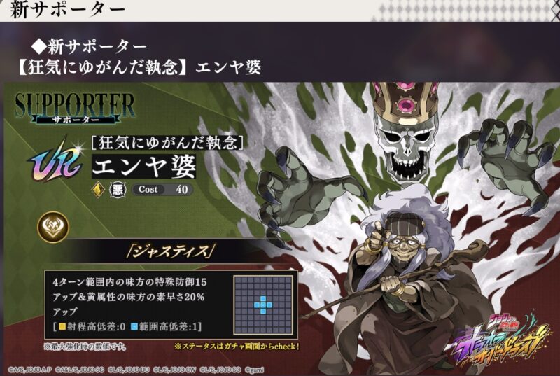 もしあなたがDIOやプロシュート、アヴドゥルといった強力なUR貴属性アタッカーをすでに所持し、育成も進めているのであれば、エンヤ婆を狙う価値は非常に高いです。