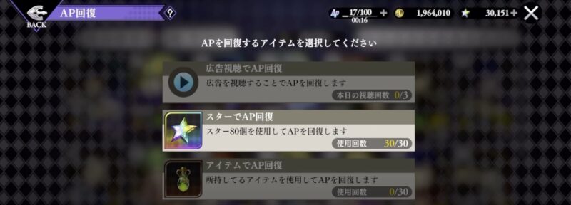 • スター割り(石割り)のタイミングと回数: どうしてもAPが足りない場合、ゲーム内通貨である「スター(石)」を消費してAPを回復する「スター割り」も有効な手段です。 ただし、スターはガチャや他の貴重なアイテムの購入にも使うため、計画的に利用する必要があります。 私の場合、3回ほどスター割りを行いましたが、これはあくまで最終手段と考えるべきです。 レベルが85を超えてからの強化ドリンク不足は深刻になるため、その時期に集中してスター割りを行うのが効率的です。