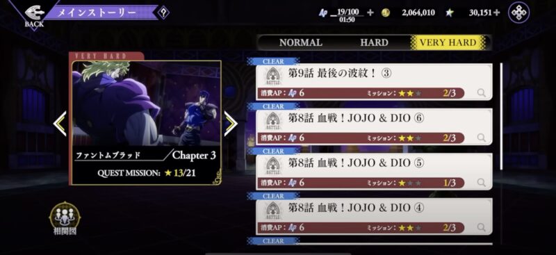 • クリアの目安: 私の場合、ディオがレベル70〜80くらいになった時点で、ようやくベリーハードのクリアが安定し始めました。 最初は難しく感じるかもしれませんが、一点集中でキャラクターを育てれば、必ず突破できるレベルです。