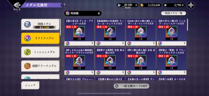 私自身、現状ではアタッカー(ワムー、1部ディオ)が1凸済みであり、3部ディオも無凸ながら強力に運用できているため、戦力的に慌ててメダルを使う必要性を感じていません。 そのため、今回はメダルを温存するつもりです。