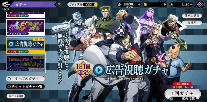 ショップの「ガチャ」タブにある「広告視聴ガチャ」がそれで、1日1回限定で引くことができます。