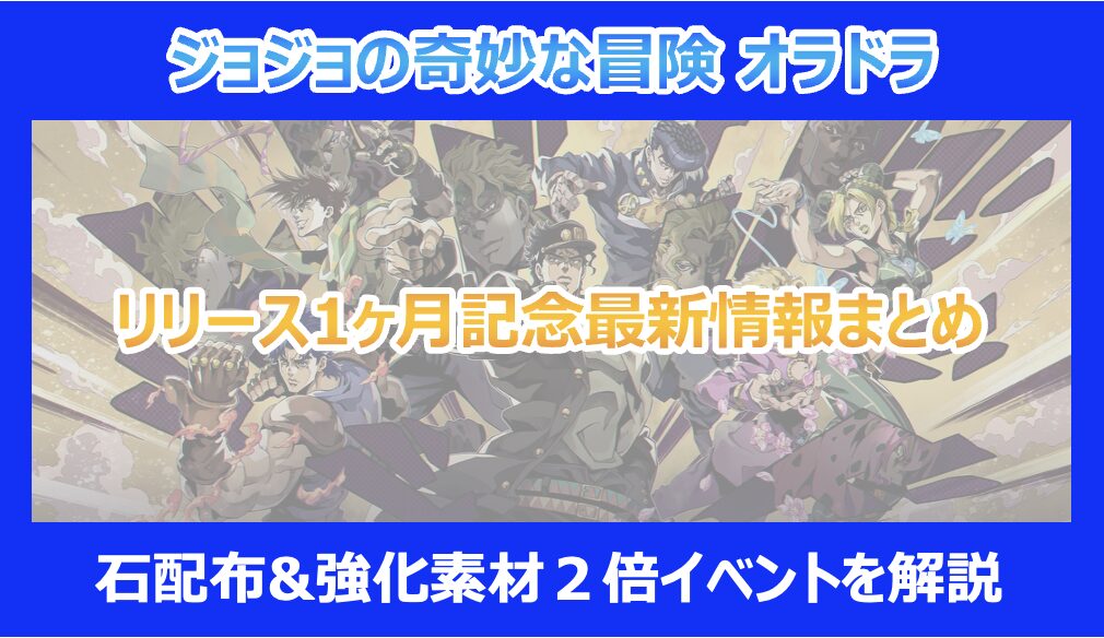 この記事を読んでいる方は、リリースから1ヶ月が経過した「ジョジョの奇妙な冒険 オラオラオーバードライブ」(オラドラ)の、記念イベントの詳細が気になっていると思います。 「なんだか内容が熱いらしい」という噂は耳にしつつも、具体的に何をすればお得なのか、どのイベントを優先すべきなのか、詳細を把握しきれていない方も多いのではないでしょうか。