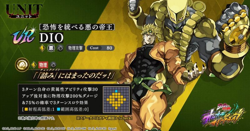 配布ディオが攻撃特化の性能だったのに対し、こちらは攻撃と耐久を両立させたバランス型の万能アタッカーです。 SSランクの中でも頭一つ抜けていると評価する声も多い、現環境の寵児。