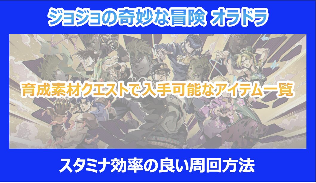 この記事を読んでいる方は「ジョジョの奇妙な冒険オラオラオーバードライブ」での育成素材クエストの種類や、そこで手に入るアイテム、そして何よりもスタミナ効率の良い周回方法が気になっていると思います。