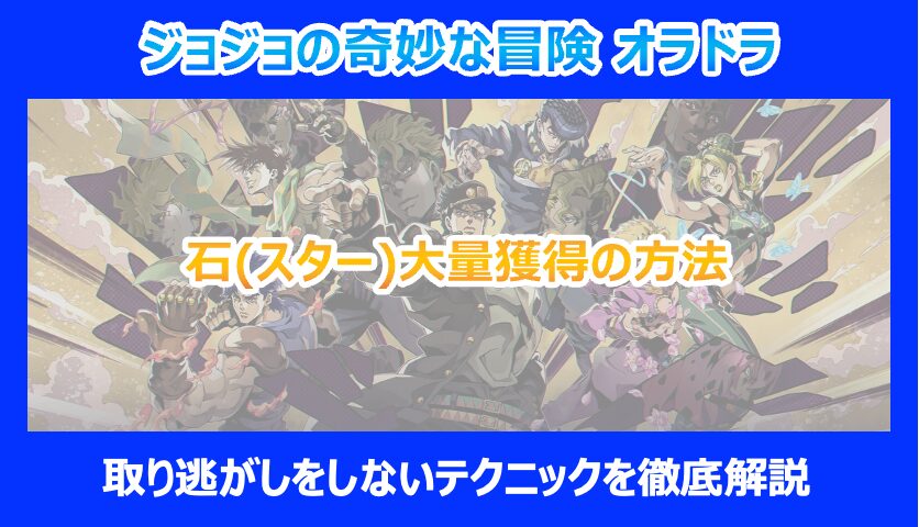この記事を読んでいる方は、リリースされたばかりの『ジョジョの奇妙な冒険 オラオラオーバードライブ』で、どのようにすれば多くの石(スター)を獲得し、10月1日に実装されると噂のあのキャラクターを確実に手に入れられるのか、その方法が気になっていると思います。