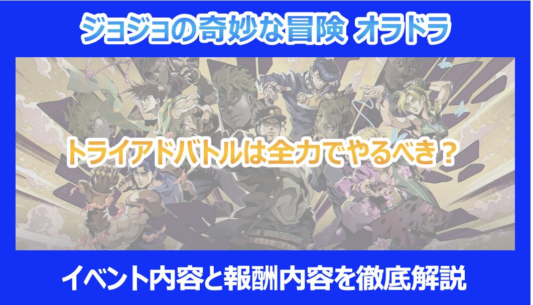この記事を読んでいる方は、Gumiが手掛けるスマホ向けゲーム『ジョジョの奇妙な冒険 オラオラオーバードライブ』(通称オラドラ)で、2025年10月8日から開始された新イベント「トライアドバトル」について、その詳細や報酬、そしてどれだけ本腰を入れてプレイすべきかという点が気になっていると思います。