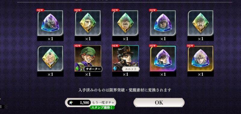 - ガチャを最大限に引く: イベント報酬やログインボーナスなどで手に入れたダイヤやガチャチケットを使って、まず可能な限りガチャを引きましょう。ジョジョオラドラは、リリース直後ということもあり、比較的多くのダイヤやガチャチケットが配布されており、100連から150連程度は十分に引けるゲームバランスになっています。