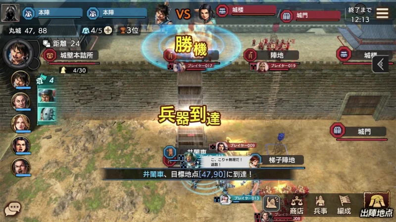 ありがちな敗戦パターンとして、各々がバラバラのタイミングで敵城に突撃し、待ち構えていた敵部隊に各個撃破されてしまうというものがあります。 これでは、せっかくの戦力を無駄に消耗するだけです。