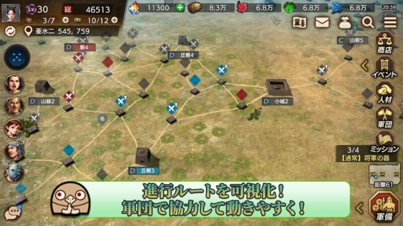 - キャラクターからの助言機能: 次に何をすればいいか、信や河了貂といったキャラクターがナビゲートしてくれる機能。ストラテジーゲーム初心者でも迷わずプレイできます。
