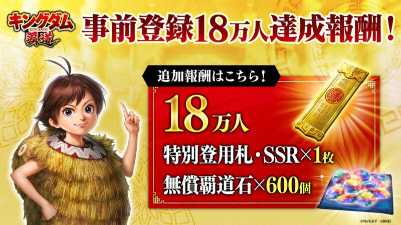 現在、「キングダム 覇道」では事前登録キャンペーンが開催されています。 登録者数に応じて、サービス開始時に全プレイヤーが豪華なプレゼントを受け取れます。 特に注目すべきは、登録者数が10万人を突破した際の報酬です。
