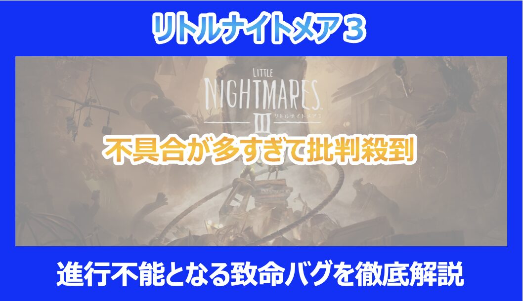 この記事を読んでいる方は、待望のシリーズ最新作「リトルナイトメア3」で多発していると噂の、進行不能バグの詳細が気になっているのではないでしょうか。