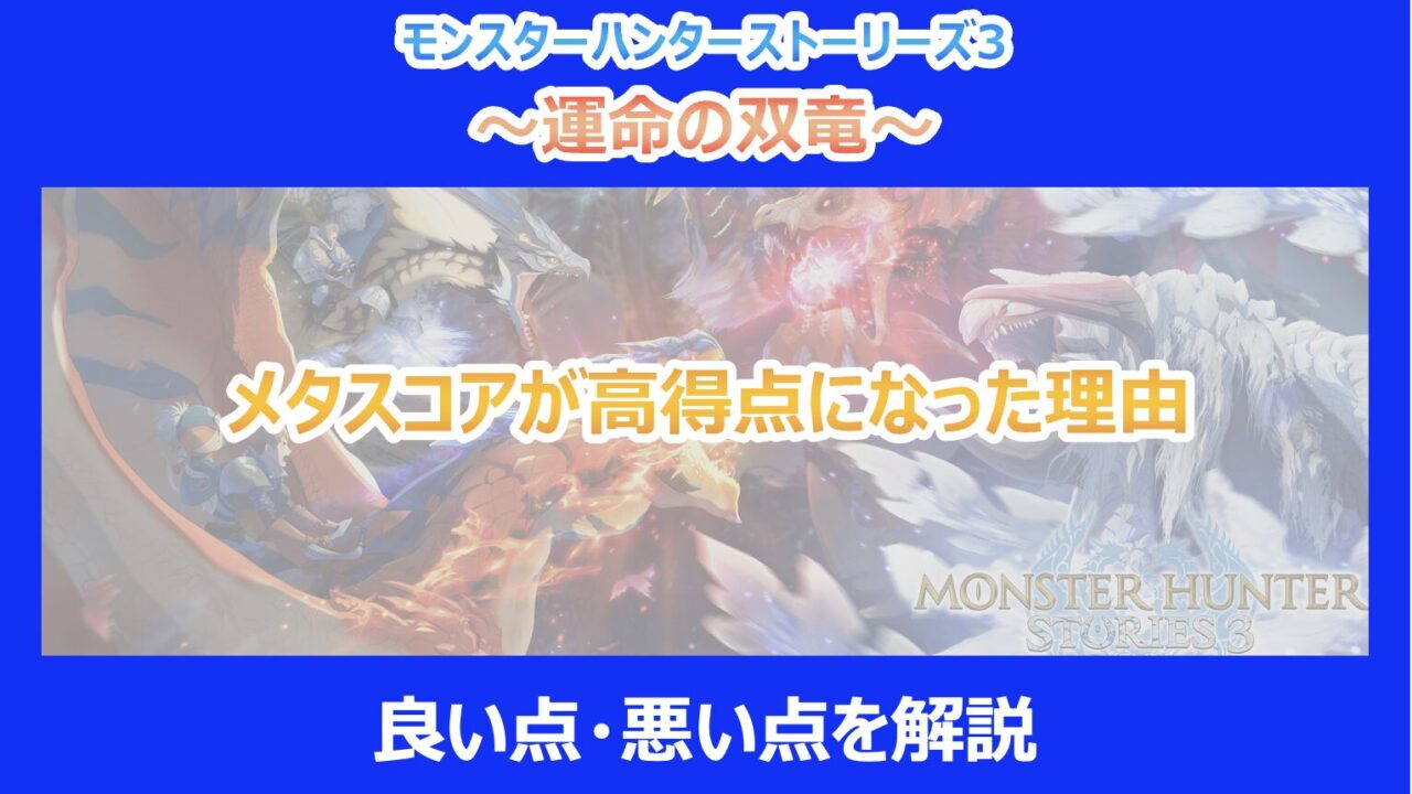 本記事では、『モンスターハンターストーリーズ3 ~運命の双竜~』のメタスコアが高評価となった理由と、 実際のプレイに基づく良い点・悪い点を詳細に解説しました。