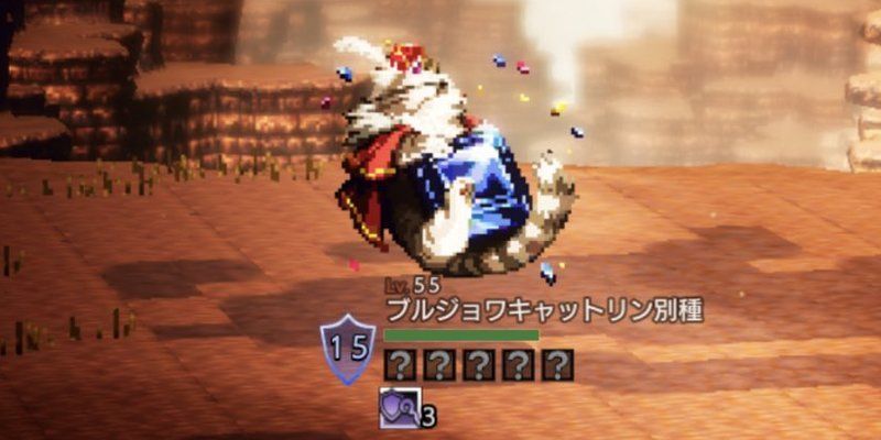 1. 確定クリティカル攻撃「会心の槍」 商人が習得するアビリティ「会心の槍」は、ブルジョワキャットリン狩りにおける最強の武器の一つです。キャットリン種は防御力が高く、通常攻撃ではダメージが1になってしまうことが多いですが、クリティカル攻撃であれば有効なダメージを通すことができます。このアビリティは必ずクリティカルが発生するため、安定してシールドを削り、HPを減らすことが可能です。 主人公を商人に設定するか、トレサなどの強力な商人キャラクターを編成に加えることはほぼ必須条件と言えます。