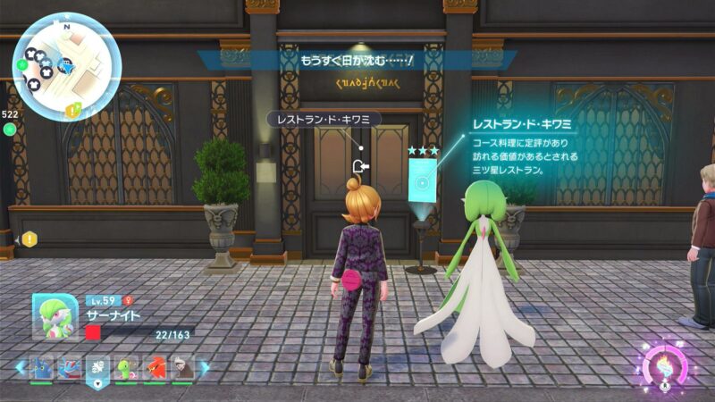自動レベル上げと金策の舞台となるのは、ミアレシティのノースサイドストリートにある格式高いレストラン、「レストラン・ド・キワミ」です。