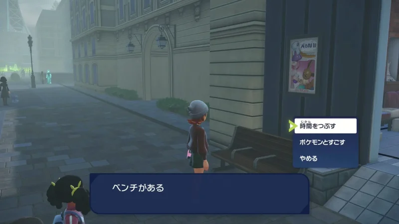本作の舞台であるミアレシティには、景観の一部として数多くのベンチが設置されています。 これらは単なる休憩用のオブジェクトではありません。 プレイヤーがベンチに座ると、「時間をつぶす」という選択肢が出現します。 これを選択すると、瞬時にゲーム内の時間が「昼→夜」あるいは「夜→昼」へと切り替わるのです。