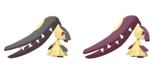 そして、レジェンズシリーズ特有のシステムである「オヤブン個体」。 通常の個体よりも体が大きく、目が赤く光るオヤブン個体は、初期レベルや「がんばレベル」が高く設定されており、即戦力としても非常に優秀です。 この「オヤブン個体」であり、かつ非常に低い確率でしか出現しない「色違い」のクチートは、まさに最高のステータスと言えるでしょう。 通常のクチートが黒とピンクを基調としているのに対し、色違いはより鮮やかな黄色と紫の色合いとなり、その希少性も相まって多くのコレクターが追い求める至高の逸品なのです。