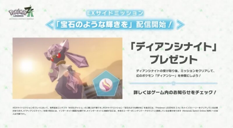 この記事を読んでいる方は、2025年11月6日に公開された『ポケモンレジェンズ Z-A』の追加DLC「M次元ラッシュ」2ndトレーラーを見て、「ディアンシナイト」の入手方法が気になっていると思います。