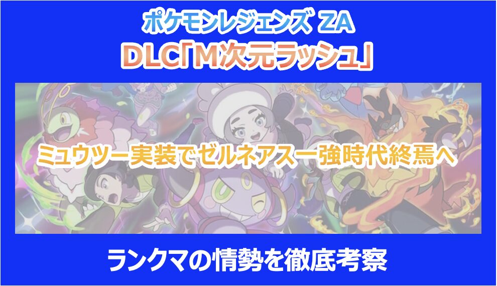 この記事を読んでいる方は、Pokémon LEGENDS Z-A(以下ポケモンZA)の追加DLC「M次元ラッシュ」による環境変化、特に「ミュウツー」の実装がランクマッチにどのような影響を与えるのか気になっていると思います。 長らく続いた「ゼルネアス1強」という閉塞感漂う環境がついに動いたのか、それとも新たな魔王が生まれただけなのか。 私自身、実際にDLCを導入し、ランクマッチで徹底的に検証を行いました。
