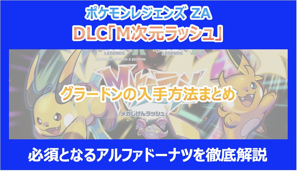 この記事を読んでいる方は、12月10日に配信が開始された待望のダウンロードコンテンツ『M次元ラッシュ』のクリア後要素、とりわけ伝説のポケモン「グラードン」の入手方法や、その過程で立ちはだかる「アルファドーナツ」のレシピについて気になっていると思います。