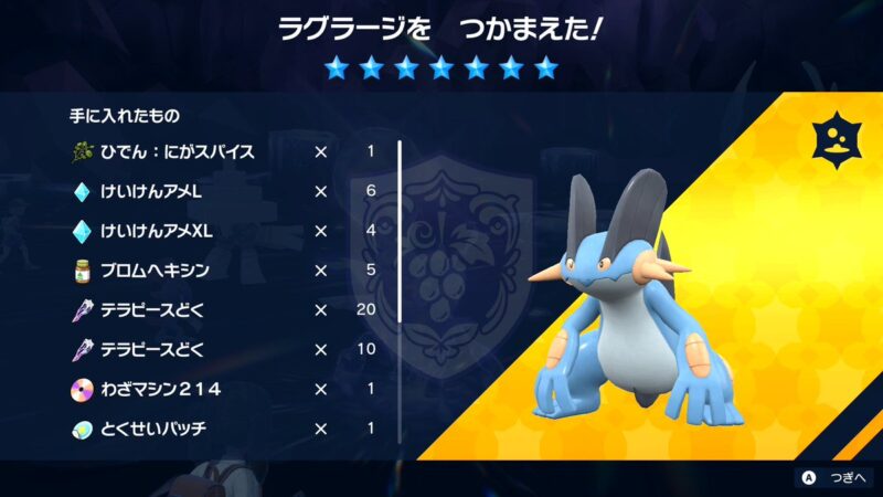 捕獲の際は、相手の攻撃を耐えつつ状態異常(まひ、ねむり)を付与できるポケモンを先発させましょう。ラグラージ自身も「じしん」などの高火力技を使ってくるため、不用意に削りすぎると倒してしまうリスクがあります。「みねうち」を使用する際は、ゴーストタイプ以外のポケモンで、かつ水・地面技を半減できる「くさ」タイプのポケモン(キノガッサなど)が適任です。