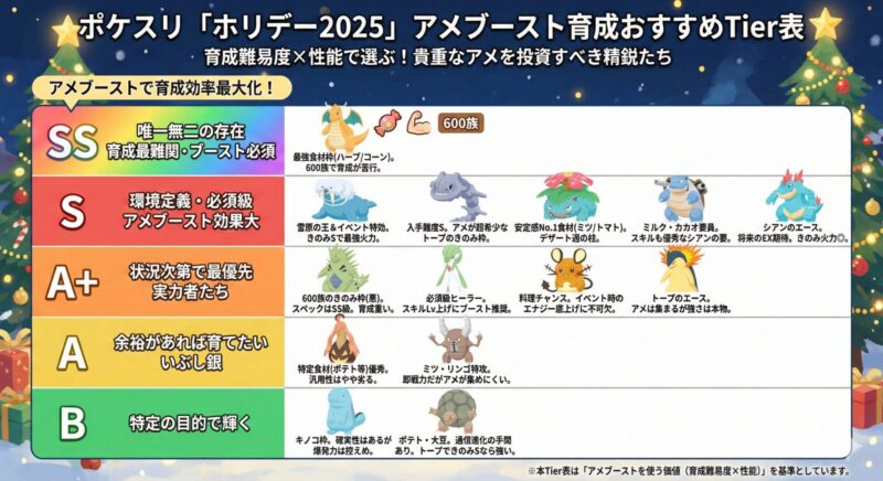 【ポケスリ】「ホリデー2025」のアメブーストで厳選すべきポケモン|Tier形式で徹底解説