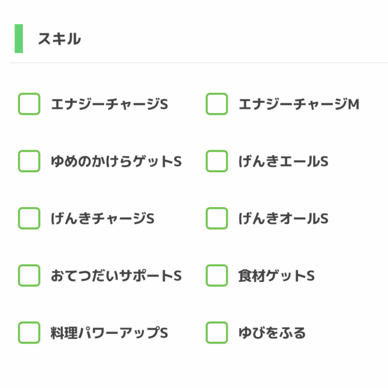 (※エナジーチャージM(ランダム)や夢のかけらゲットSなども存在しますが、ここでは代表的な固定値のスキルを記載しています)