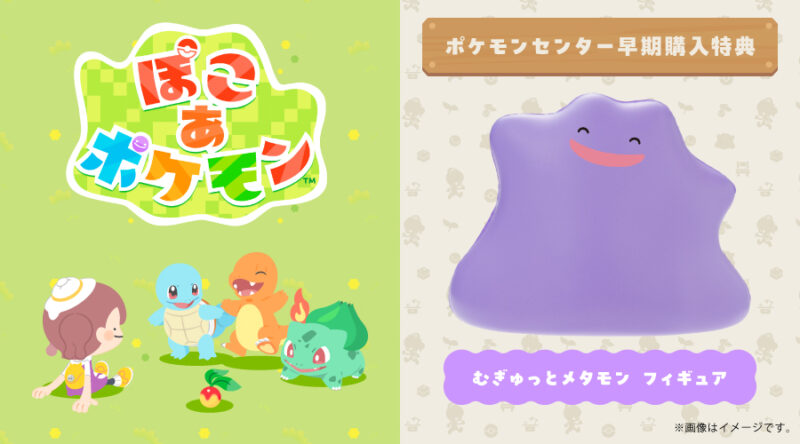 ポケモンセンター(実店舗)およびポケモンセンターオンラインで『ぽこあポケモン』を早期購入すると、特典として**「むぎゅっとメタモン フィギュア」**が付属します。