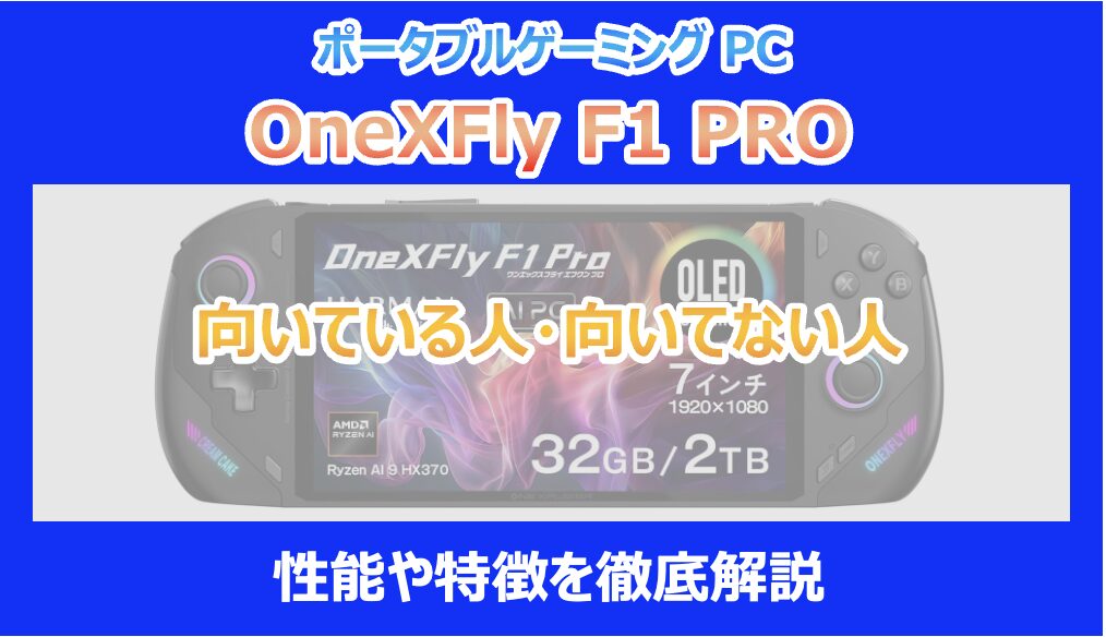 この記事を読んでいる方は、One-Netbook社から登場した最新のポータブルゲーミングPC(UMPC)、「OneXFly F1 PRO」が気になっているのではないでしょうか。 「次世代チップ搭載って、どれくらいすごいの?」 「ROG Allyや他のUMPCと比べてどう?」 「価格も高いみたいだけど、自分に本当に合っているのかな?」 そんな疑問を抱えているかもしれませんね。