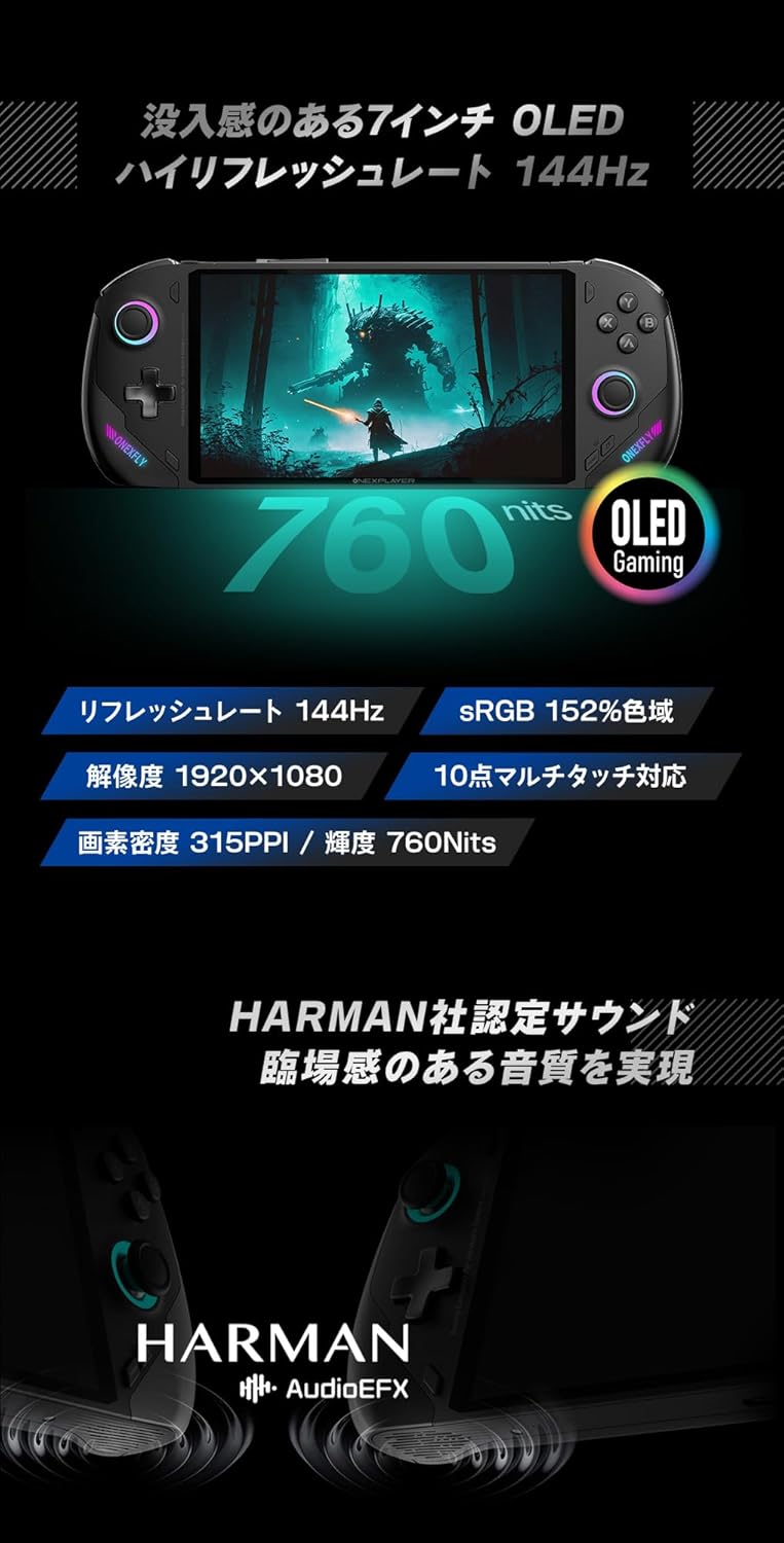 OneXFly F1 PROは、フルHD (1080p) 解像度を基本としています。 8840Uモデルは高精細な120HzのIPS液晶を、AI 9モデルはさらに美しい144HzのOLED (有機EL) を搭載しています。
