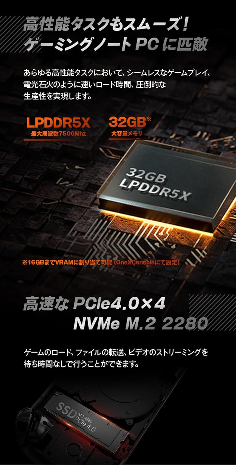 メモリ(RAM)は、ゲームのロード時間やマルチタスク性能に影響します。 OneXFly F1 PROは全モデルで32GB以上、しかも高速な7500MHzのLPDDR5Xメモリを搭載しています。 これはSteam Deckの16GB(5500MHzまたは6400MHz)と比べて倍の容量と高速さを誇り、特に最近のメモリを大量に消費するAAAタイトルや、ブラウザを開きながらゲームをするといった使い方で差が出ます。