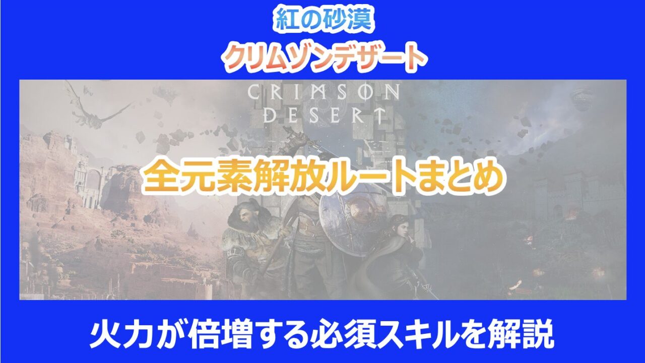 この記事を読んでいる方は、広大なオープンワールド「紅の砂漠」で「全元素を効率よく解放したい」「火力が足りなくてボスに勝てない」と悩んでいるのではないでしょうか。