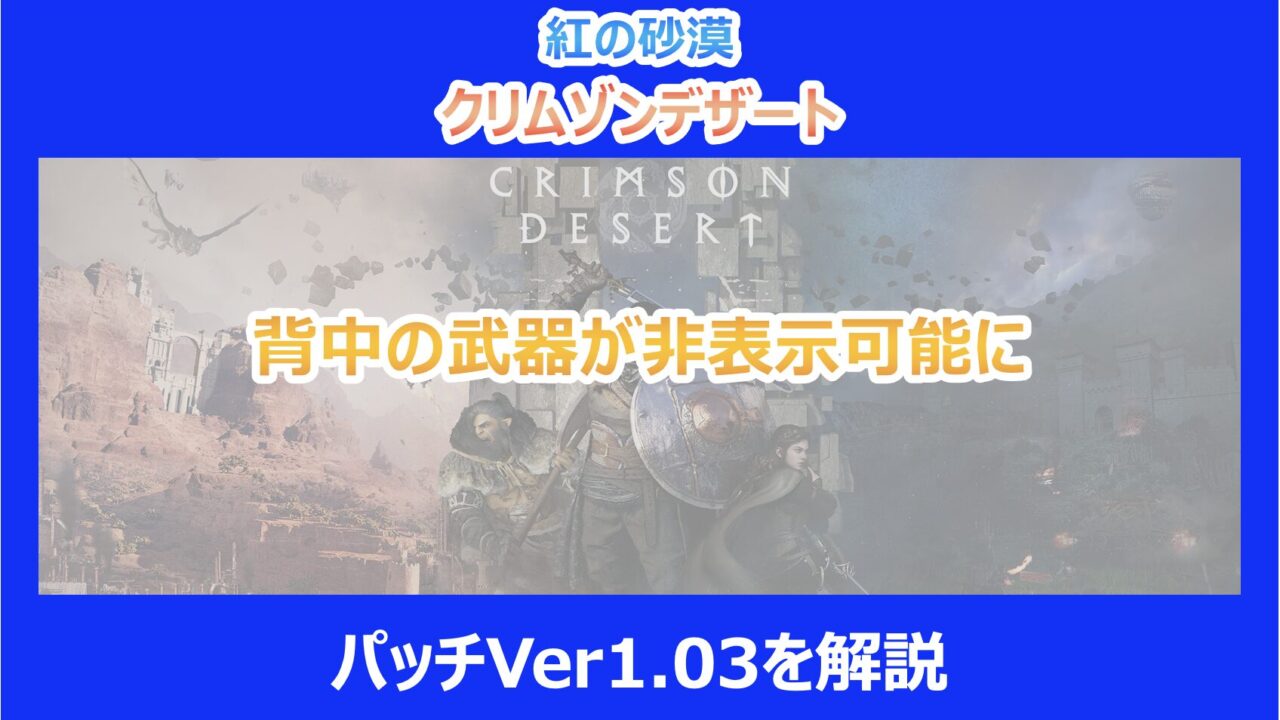 この記事を読んでいる方は、『紅の砂漠(クリムゾンデザート)』の最新パッチVer1.03で追加された「背中の武器の非表示設定」について詳しく知りたいと思っているはずです。