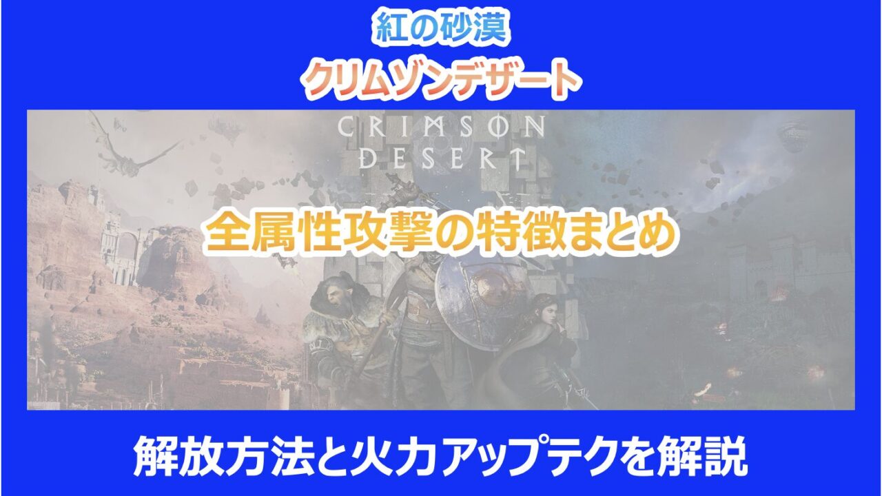 この記事を読んでいる方は『紅の砂漠(クリムゾンデザート)』における全属性攻撃の解放方法や、それぞれの具体的な特徴、そして実戦で役立つ火力アップの手順が気になっていると思います。