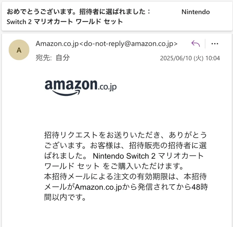 複数当選した場合の対処(再掲): 本体単品とマリオカートセットの両方に当選した場合、欲しい方(例: マリオカートセット)だけを購入手続きしてください。 もう一方(本体単品)は、48時間放置すれば自動的にキャンセルとなり、ペナルティもありません。