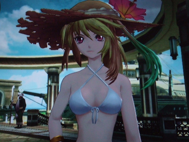 ミラの水着は、紫を基調としたビキニタイプです。 シンプルなデザインながら、胸元や腰の装飾がアクセントとなっており、大人びた雰囲気を醸し出しています。 彼女の美しいプロポーションが際立つこの衣装は、セクシーさを求めるプレイヤーの期待に十二分に応えてくれるでしょう。 また、パレオ(腰布)は着脱可能になっており、プレイヤーの好みでさらに露出度を調整することができます。 この水着に着せ替えて、南国の街「ニ・アケリア」などを散策すれば、まるでバカンスに来たかのような気分を味わえるかもしれません。